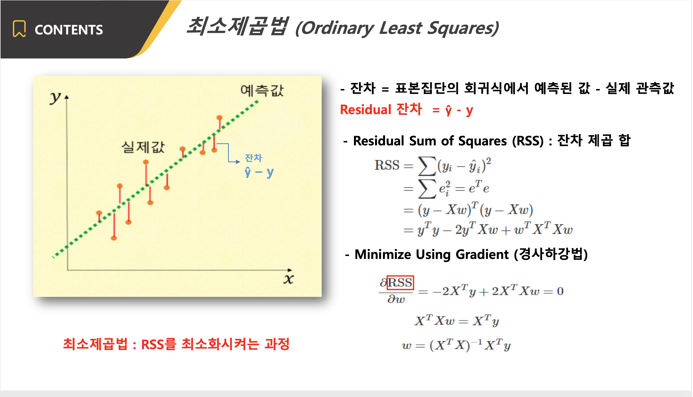 머신러닝의 기본적인 개념인 경사하강법에도 잔차제곱합이 사용됨을 알 수 있습니다.