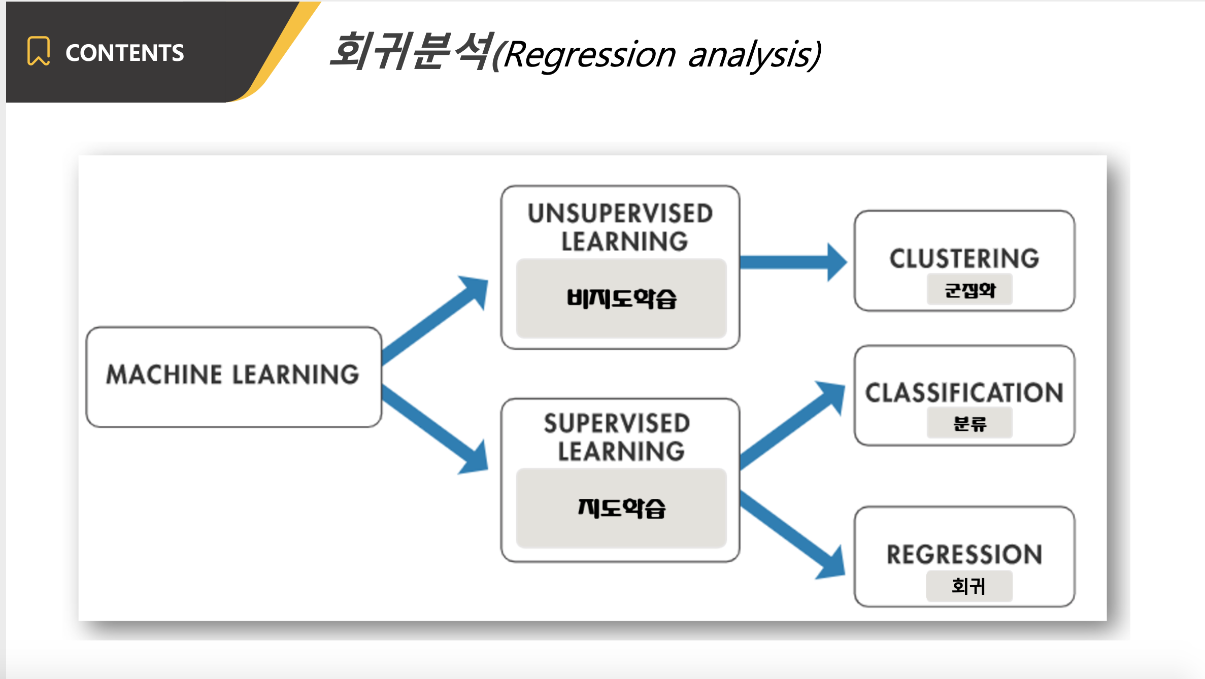 비지도학습,지도학습으로 볼 수 있으며 회귀분석은 이 중에서 지도학습과 깊은 관련이 있습니다.