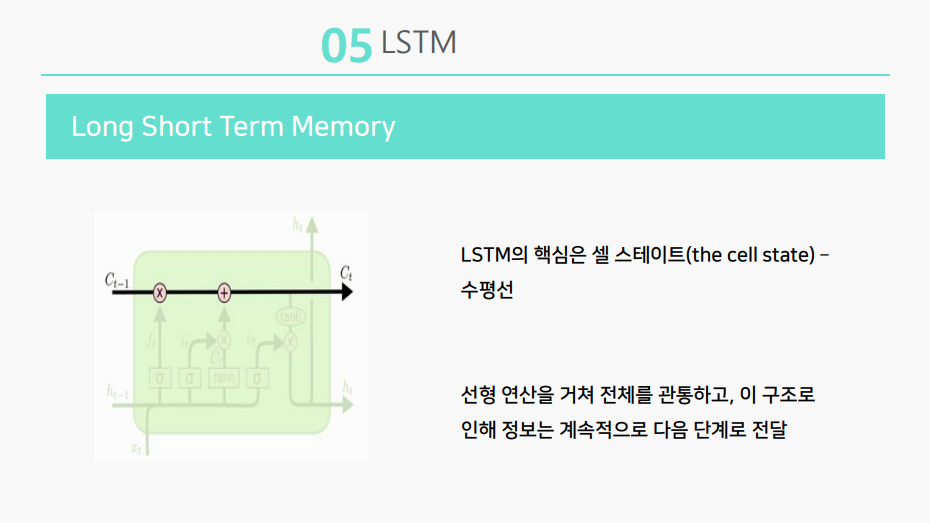 LSTM의 핵심은 셀 스테이트의 수평선인데, 셀 스테이트는 선형 연산을 거쳐 전체를 관통하고, 이 구조로 인해 정보는 계속적으로 다음단계로 전달됩니다.